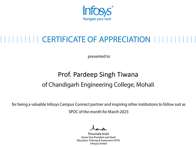 Infosys Campus Connect is an industry-academia collaboration program to align engineering student competencies with industry needs. Campus Connect aims to evolve a model through which Infosys and engineering institutions can partner for competitiveness and to enhance the pool of highly capable talent for growth requirements in the IT space. Chandigarh Engineering College-CGC, Landran, Mohali has been recognized as an Advanced Partner Institute in the Infosys Campus Connect Program. Infosys renewed its MoU with Chandigarh Engineering College-CGC, Landran, Mohali in December 2021 for two years. Infosys extended the MoU for a further period of 2 years and it is in the renewal process. Infosys permits an industrial visit and allows the students to meet IT industry professionals. They conduct knowledge-sharing sessions and discuss the latest technologies used within the industry. Our faculty members also participated in the Faculty Enablement Program(FEP) conducted by the Infosys Campus Connect team.